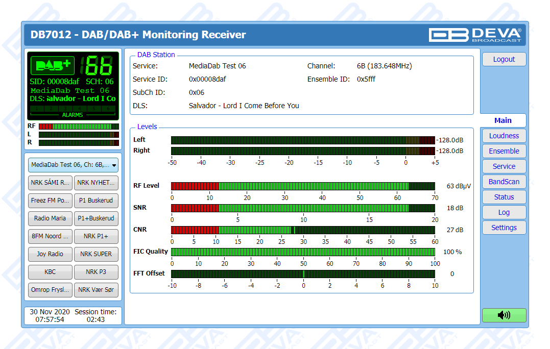 Als toonaangevende fabrikant van geavanceerde broadcasttechnologie is het DEVA’s doel om continu topapparatuur te leveren in lijn met de belangrijkste trends in de sector. Daarom heeft ons team een hoogwaardige productlijn ontwikkeld die is gericht op digitale radio-uitzendingen. Als onderdeel daarvan voldoet de DB7012 volledig aan de ETSI EN 300 401 DAB-standaard. Daarnaast ondersteunt hij Program Associated Data (PAD), alle standaard bitrates en VBR, en toont hij automatisch live metadata. Tijdens het monitoren en loggen meet de DB7012 de volgende DAB-parameters: RSSI, SNR, CNR, FIC Quality, FIB Errors, FFT Offset en de waarden van Left & Right Audio levels. Deze worden opgeslagen voor latere analyse. De verzamelde data kan eenvoudig worden gedownload via een standaard FTP-client.
